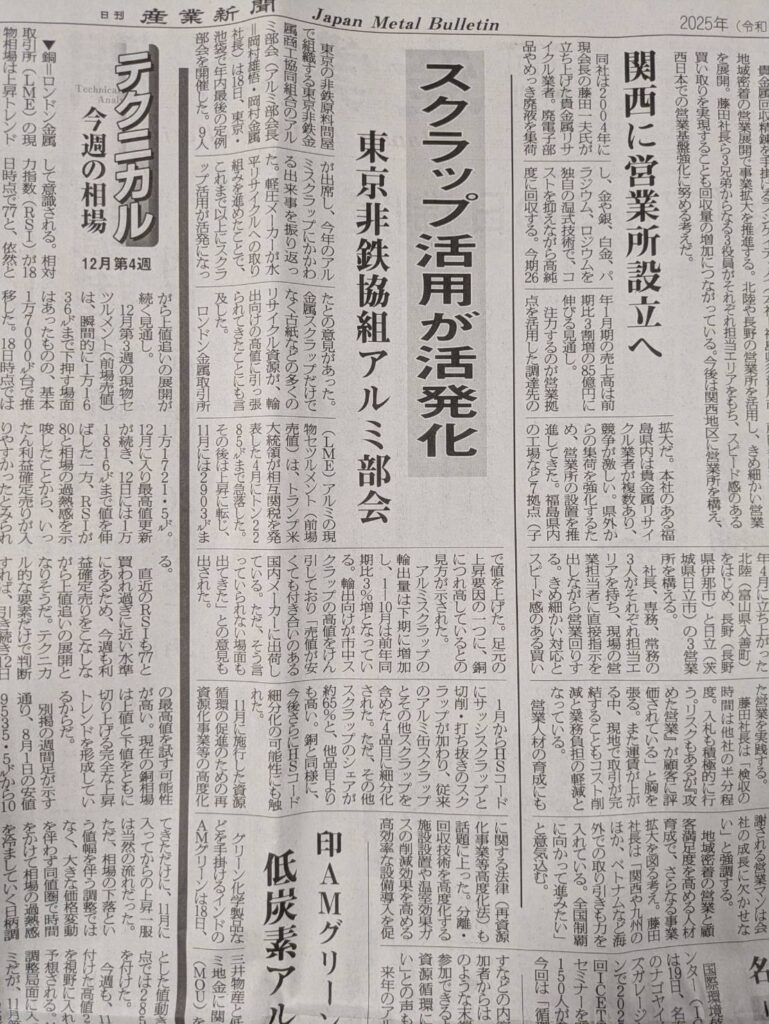 12/18に開催した東京非鉄金属商工協同組合のアルミ部会の定例会に関する記事を掲載いただきました。