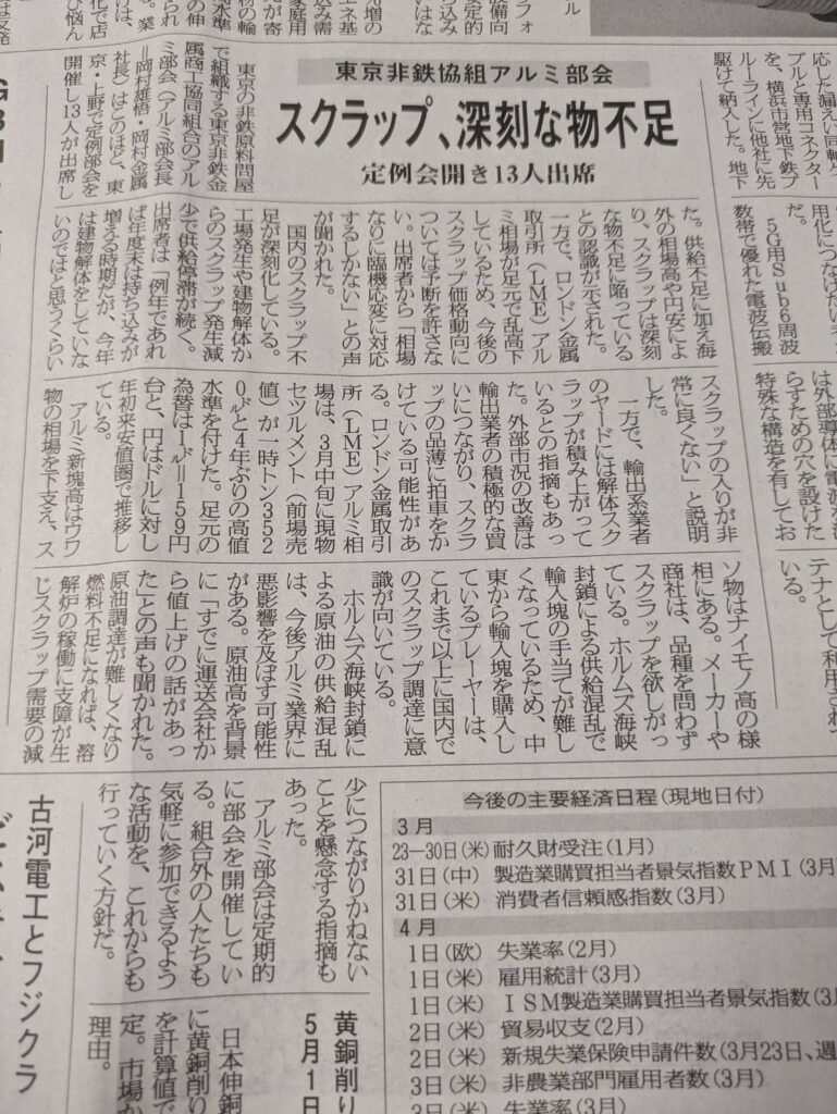 東京非鉄協組 アルミ部会の定例会に関する記事を掲載いただきました。